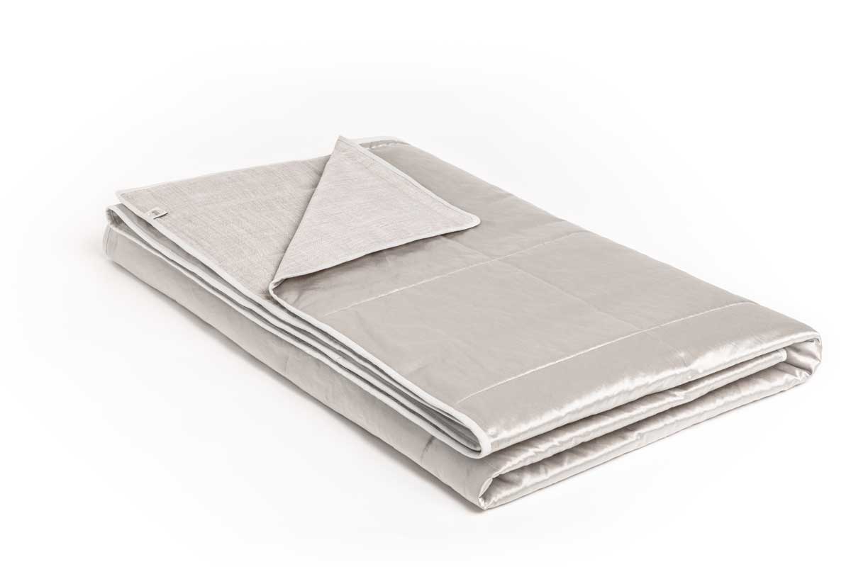 Bedspread and cushion Sublime perform a striking dance of colour and texture. An exquisite set, showing remarkable contrasts. Fabric of a rich cotton polyester metal blend with an elegant shine in solid Sand, combined with mixed colours Light Grey Melee and a sturdy feel. Two sides of beauty in one reversible set.