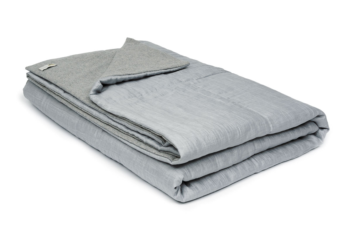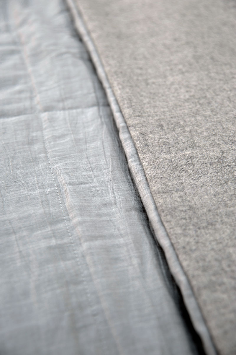 Infinity is overtuigend aanwezig in de ruimte. De tweezijdige, gewatteerde sprei is samengesteld uit verschillende stoffen, elk met een kenmerkende touch. Een zijde is uitgevoerd in linnen met een charmante crinkle en subtiele glans. Het linnen is gestept in een onregelmatig blokpatroon. De andere zijde is een mix van wol en polyamide nylon met Global Recycled Standard label. Een intrigerend spel van stoffen en texturen.
