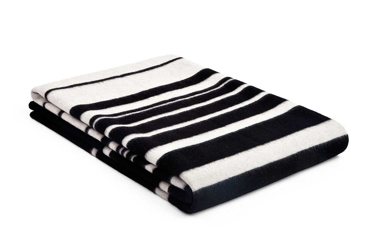 Cotton woollen blanket Blake with uneven stripes measures 160 x 290 cm and is finished with a blanket stitch all around.