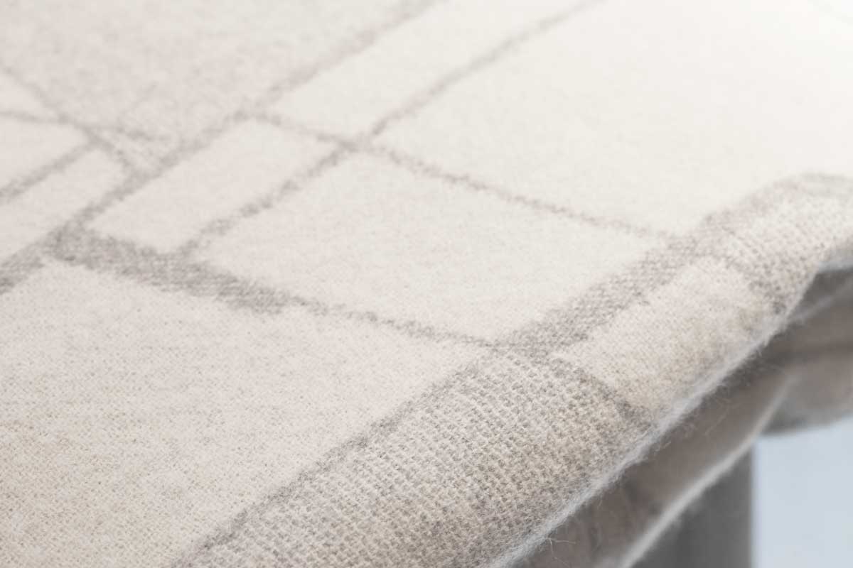 Crystalline is a fringed 100% wool jacquard blanket. Its pattern is a unique Mrs.Me design, inspired by the organic geometry of architectural lines in nature. A smart composition of rectangular shapes in light grey and natural tones, rendering wonders of nature like cracks in winter lakes or the ingenious structures of spiderwebs. Crystalline covers any style and all seasons. A warm embrace in cool summer evenings, a cosey comfort in the cold nights of winter.
