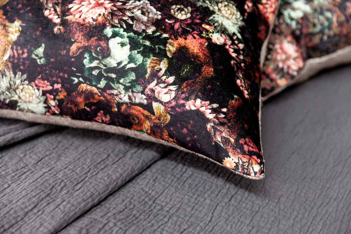 Cushion Lily shows a dynamic still life. Wonders of nature roam freely within its short pile velvet. Playful fish and joyful flowers, whose mesmerizing colours light up beautifully against the dark background.