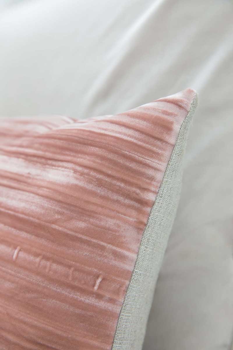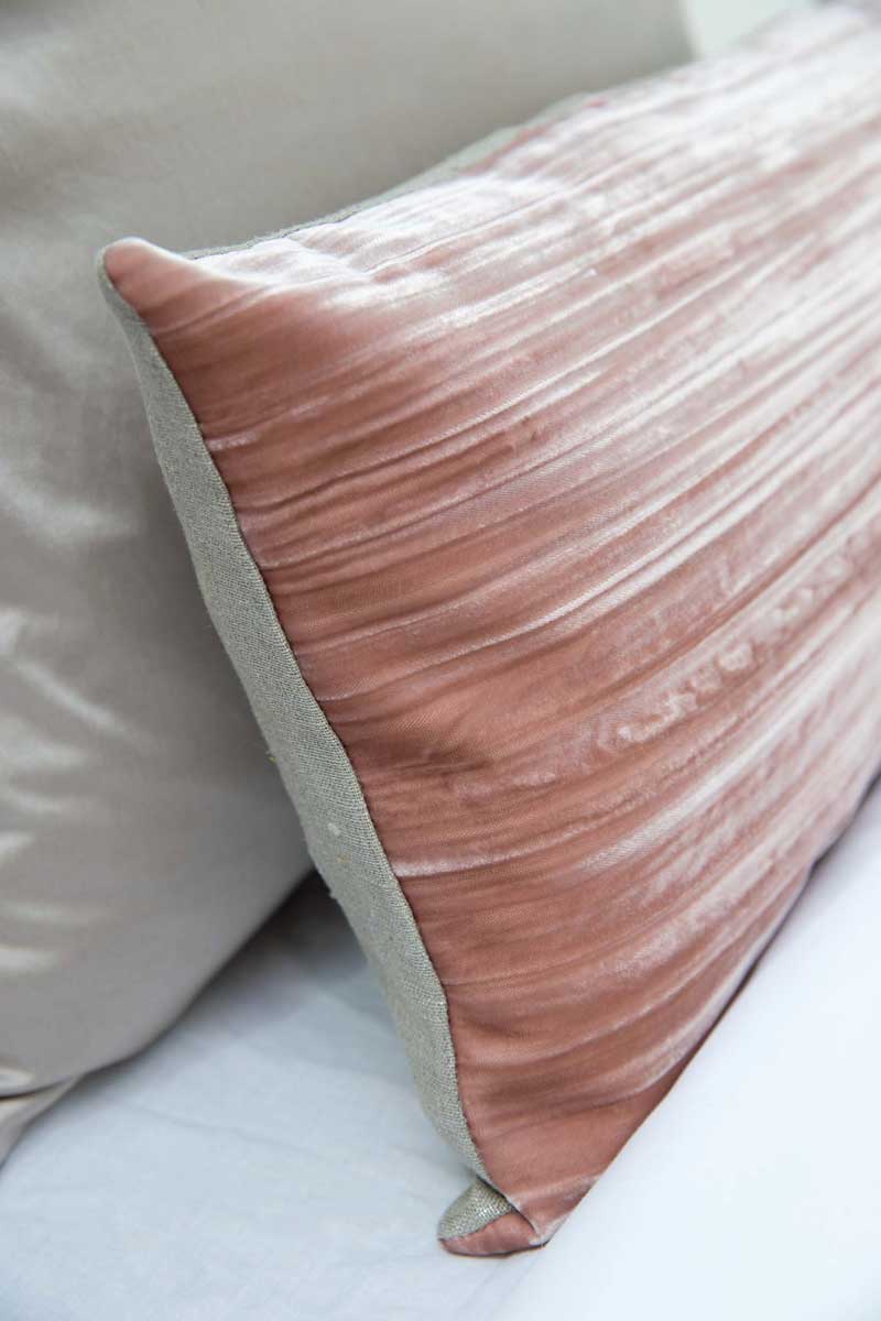 decorated bedroom. Its Rose Quartz coloured beams play a precious game of light and shadow in the crushed velvet. By this