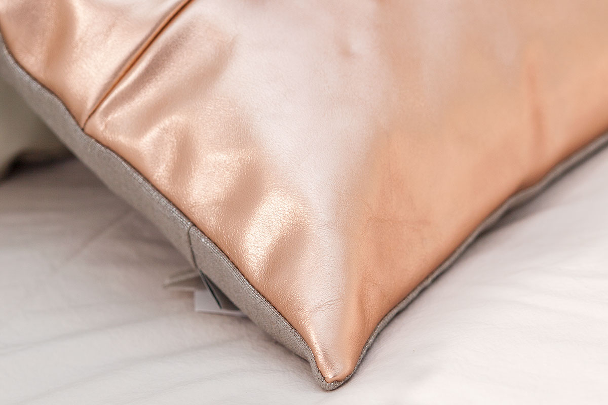 Leather cushion Pavilion has a matte metallic front. The reverse is made of silver coated linen. This decorative cushion adds an instant element of style to your bed or sofa. A feather cushion is included.