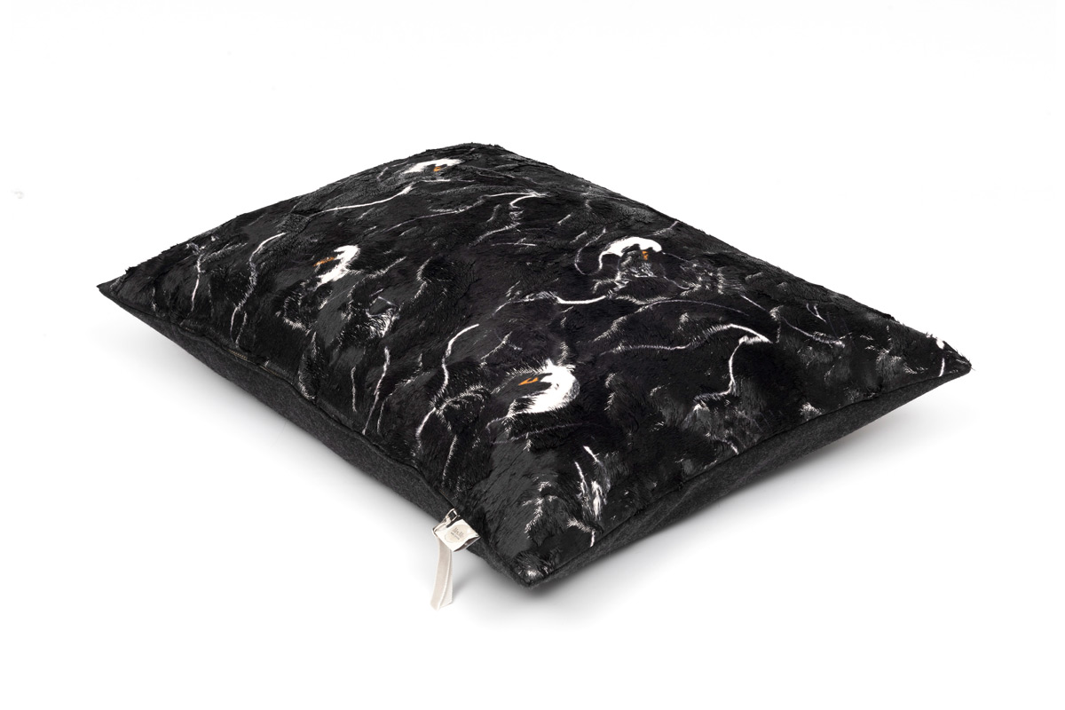Precious creatures appear within the dreamlike contours of Swan. Cushion Swan displays a pattern of white swans, following the outlines of their shape. A natural scene in rich cotton viscose velvet, made tangible by its coating. The reverse of cushion Swan consists of wool Graphite.