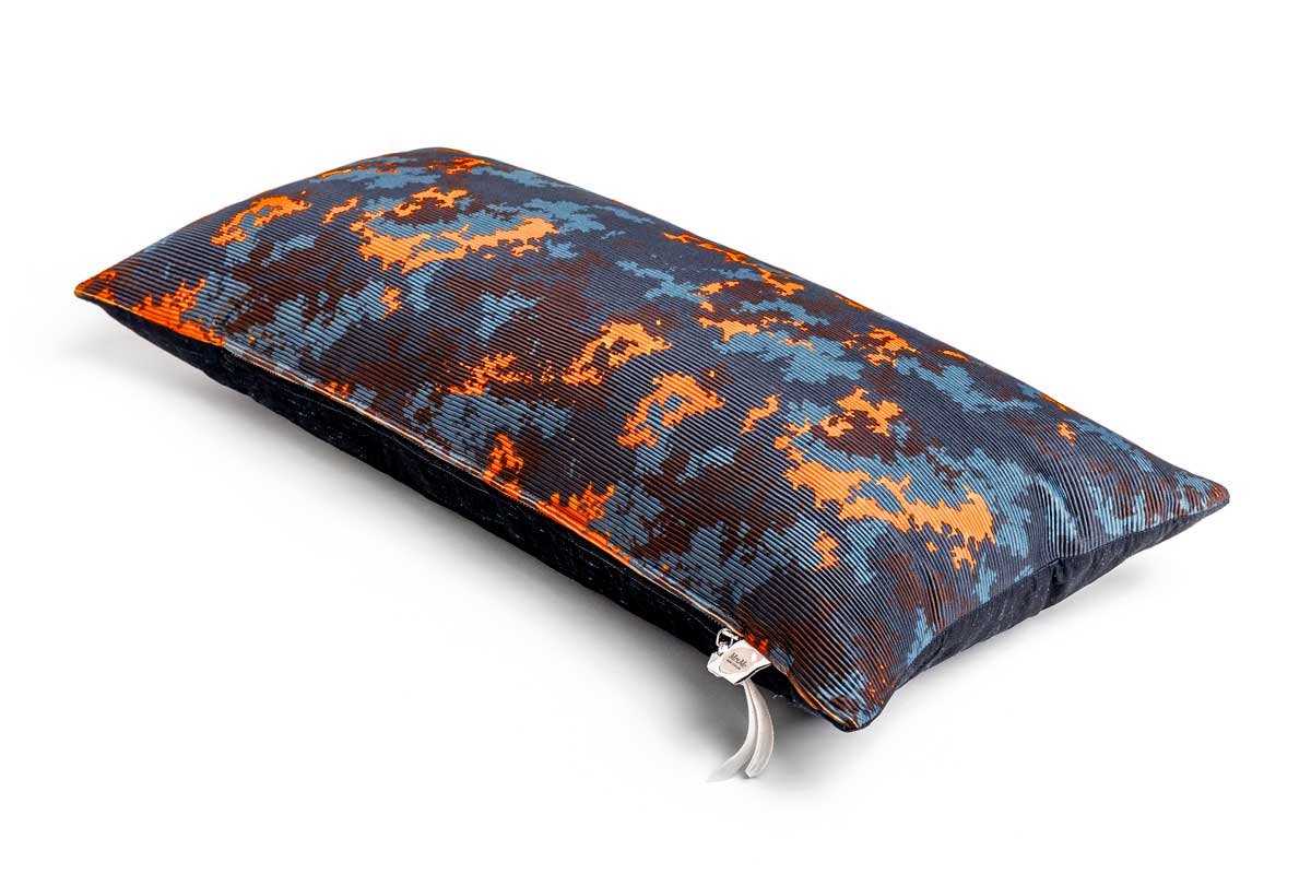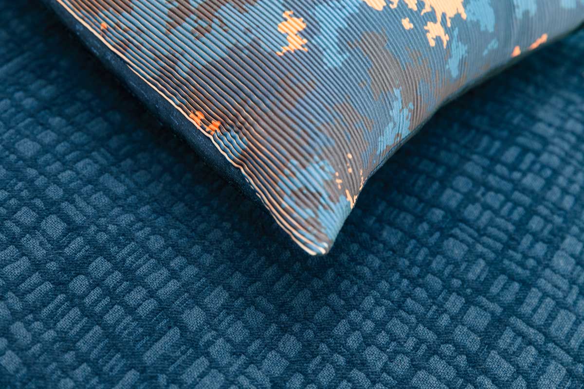 The sun rises in a ravishing conjunction of colour and shape. Cushion Universe is an exciting composition in Petrol, Blue and Orange, scattered on a rib weave in threedimensional