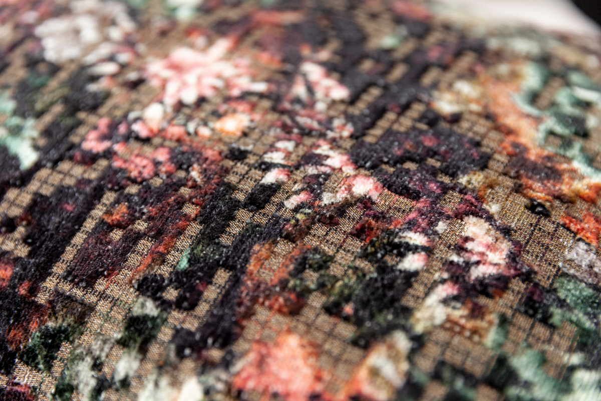 Waterlily is executed in velvet jacquard Multiblack; the reverse consists of a 100% peace silk.