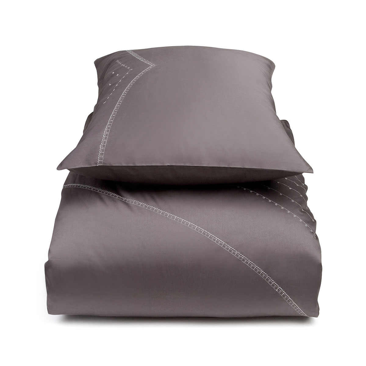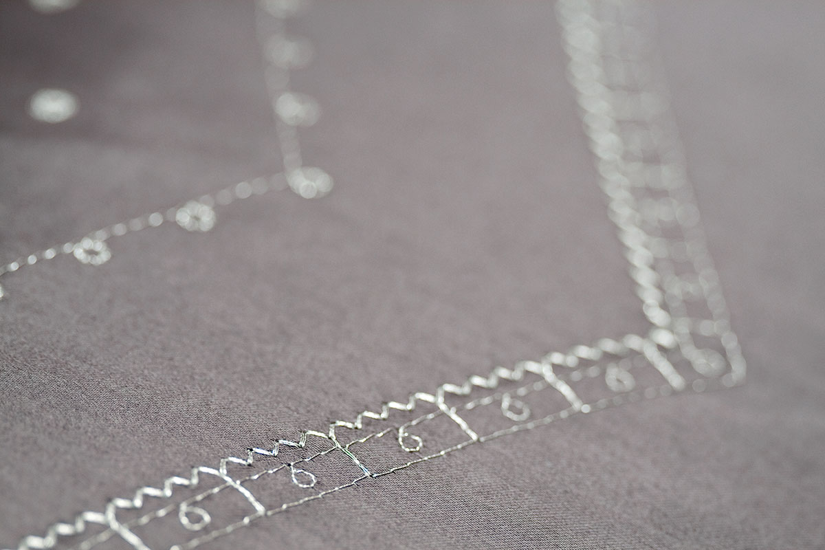 Mrs.Me’s liefde voor couture en handwerk wordt treffend vertaald in dekbedovertrek Brogue. De geborduurde versiering in zilverkleurig lurex verwijst naar het bewerkte leer van de bekende herenschoen.