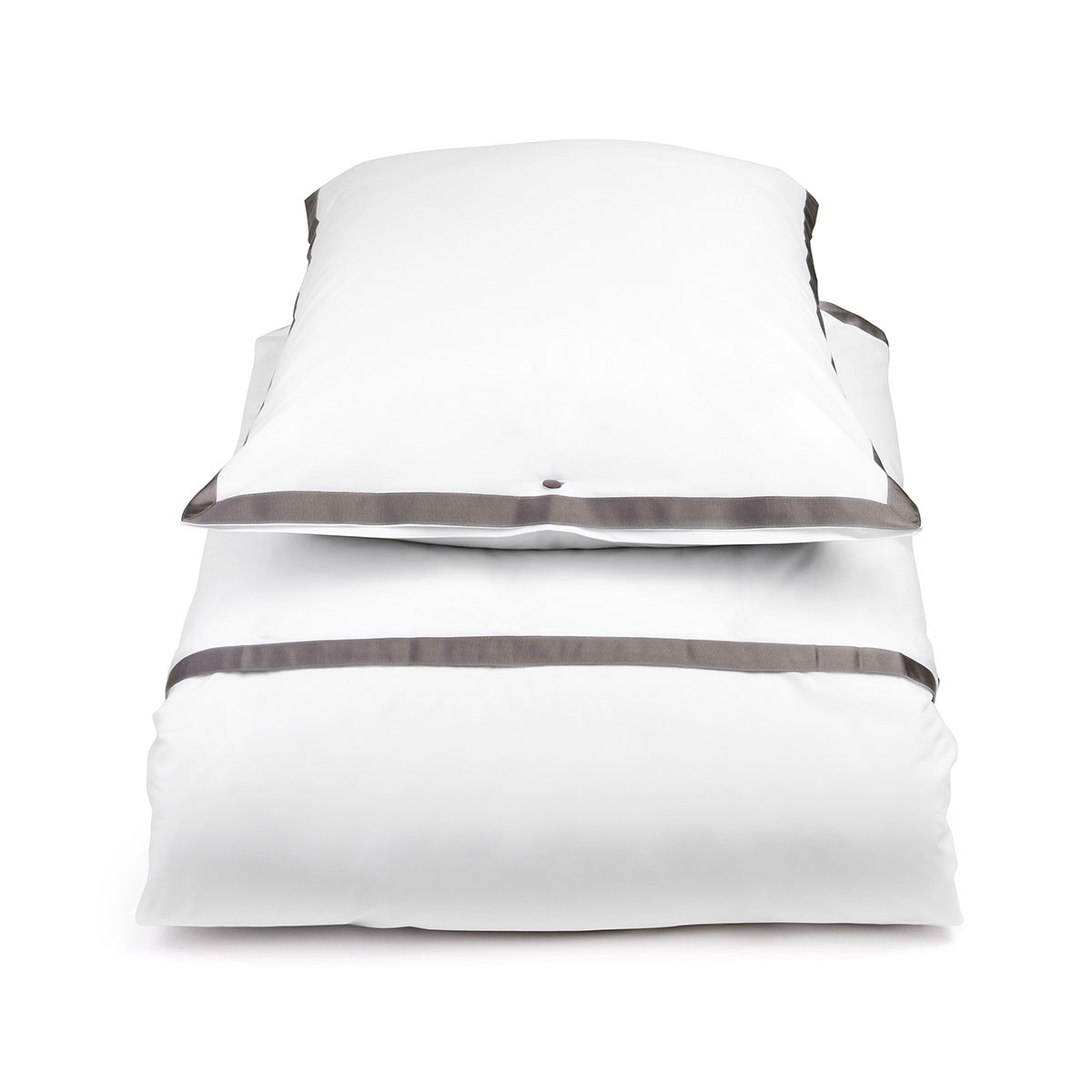 Dekbedset Contour, in 500 thread count katoen perkal, verrast met een pittig contrast tussen sneeuwwit katoen percale en een opvallende bies van grafietkleurig ribtape.