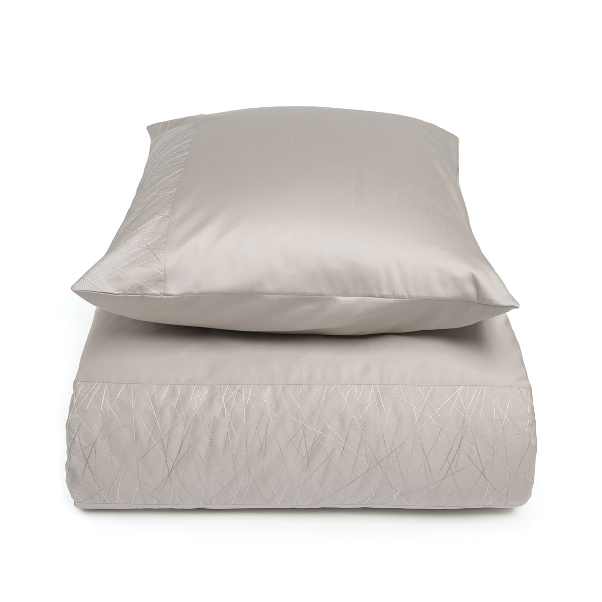 Spinsels om bij weg te dromen. Dekbedset Mesh betovert met geborduurde banen op beige katoensatijn