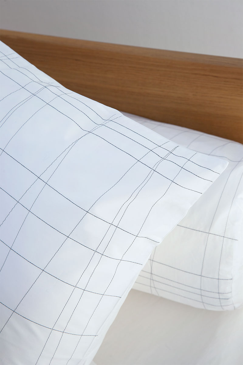 Het onregelmatige lijnenspel, all-over geborduurd in een donkergrijze kleur, vormt een subtiel grafisch dessin op dekbedovertrek en slopen Twine. Deze set is gemaakt van wit katoen perkal 300 thread count en verkrijgbaar met bijpassende nekrolhoezen.