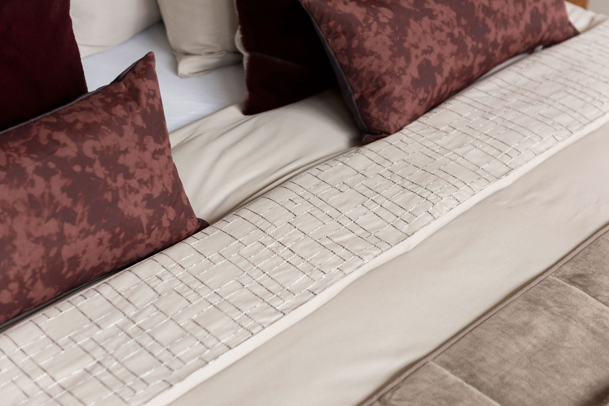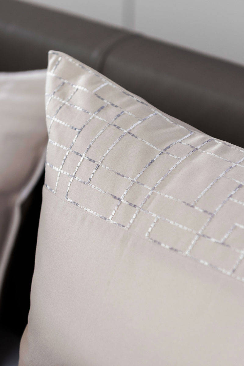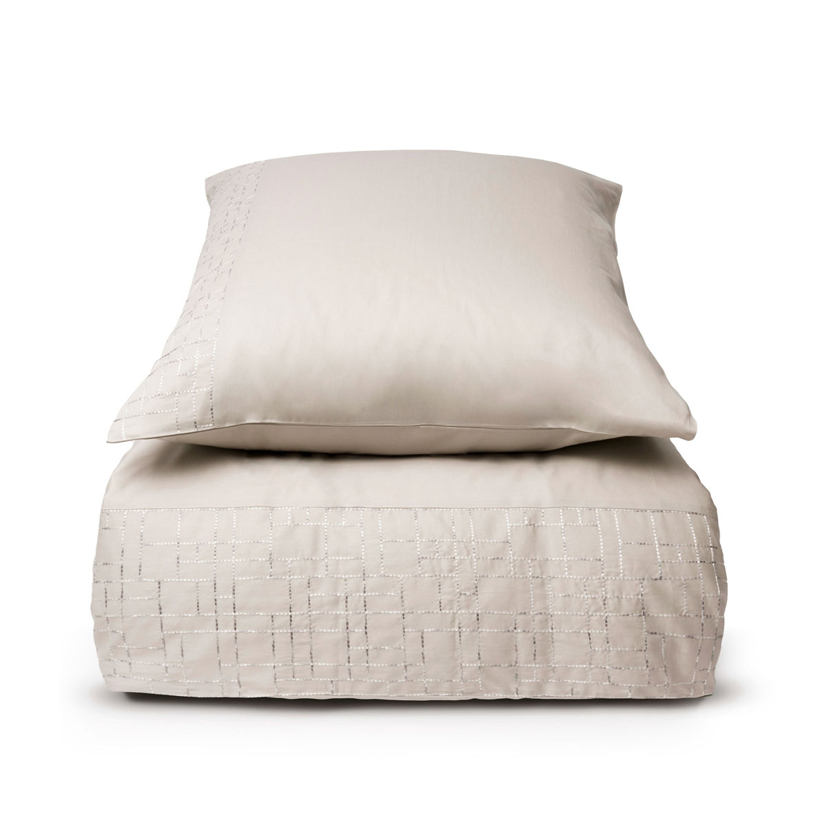 Zen is uitgevoerd in hoogwaardig katoen satijn 300tc in de kleur Beige. Dekbed en kussenslopen hebben een geborduurde rand in witte en lichtgrijze verlooptinten. Het intrigerende geometrische patroon is geïnspireerd op de lattenframes van Japanse shoji, de panelen voor kamerschermen, deuren en ramen.