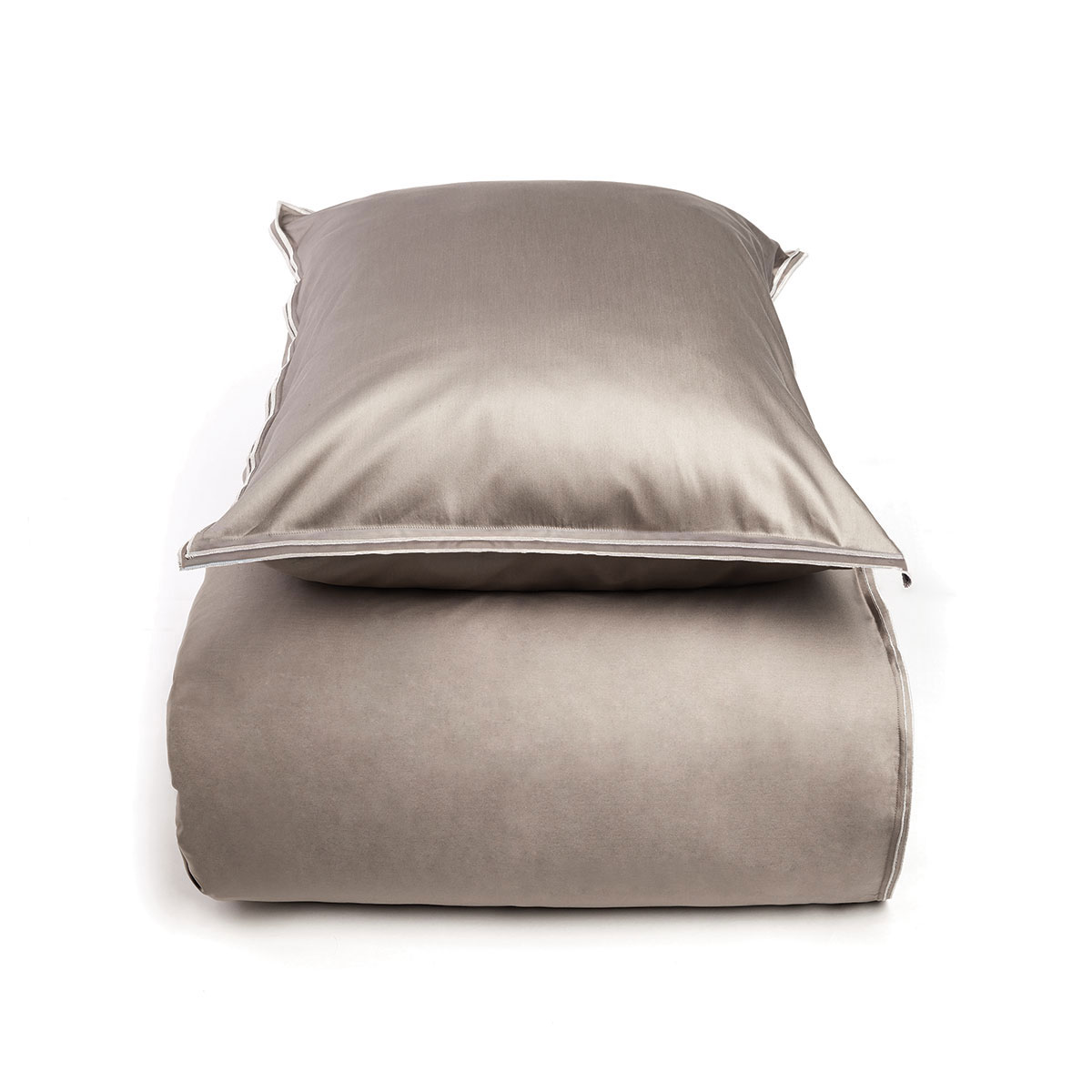 Duvet cover and pillow cases Layers are finished with a narrow overlock stitch in a contrasting colour. It is made of soft shiny cotton sateen 300 thread count.