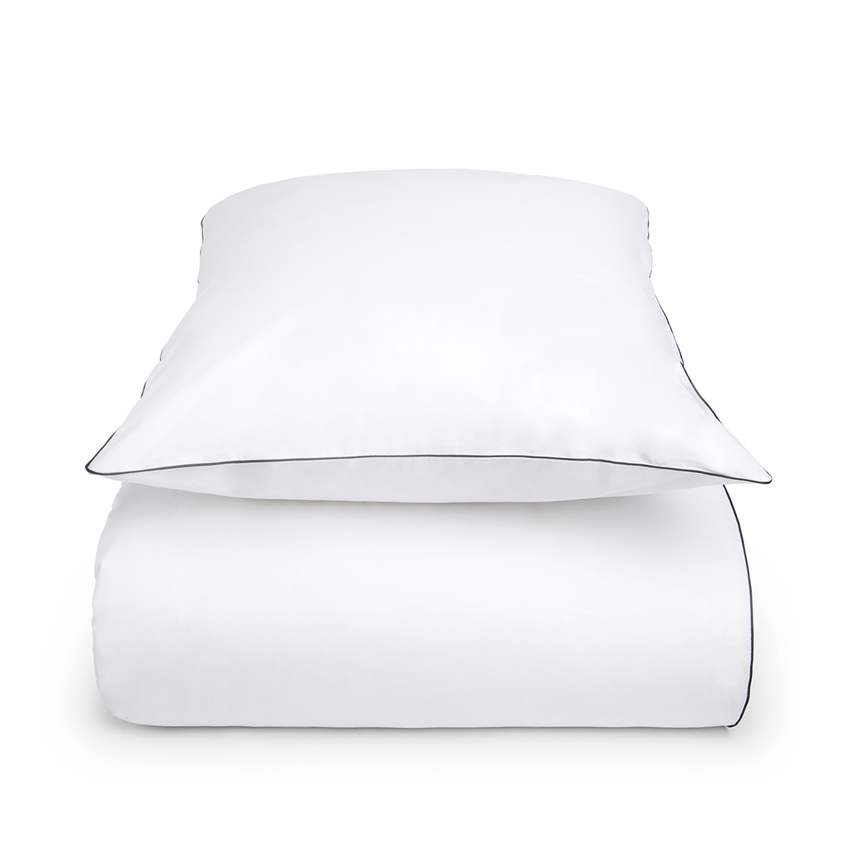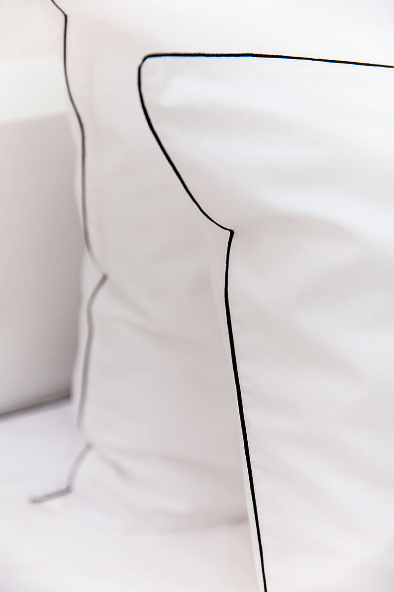Duvet cover set Lotus, in 200 threadcount cotton percale, is framed by a gossamer glossy black piping.