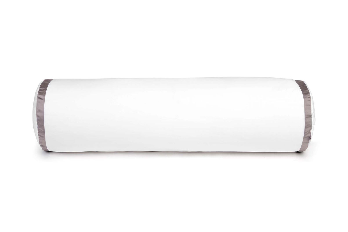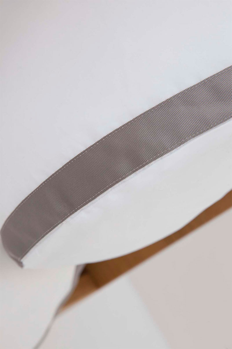 De Contour nekrolhoes, gemaakt van witte katoen perkal 400 thread count, is uitgevoerd met een contrasterende ribtape bies in een taupe kleur.