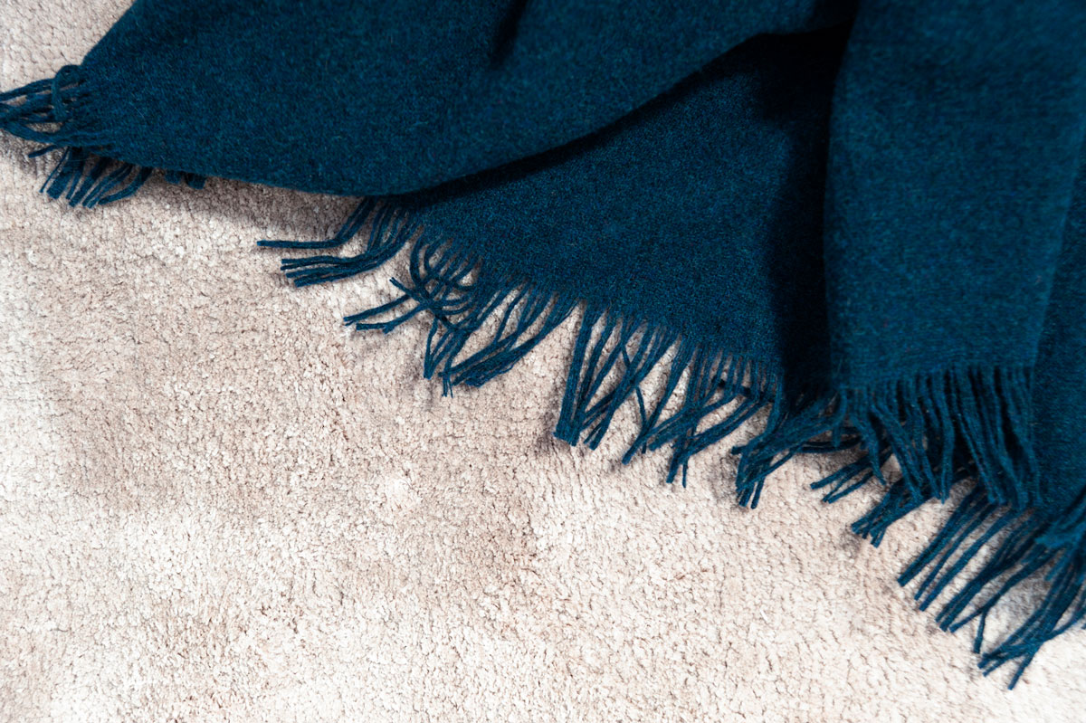 Een droom van wol en cashmere in een subtiele Steelblue kleurmelange, rondom verfraaid met speelse franje in een licht contrasterende tint.