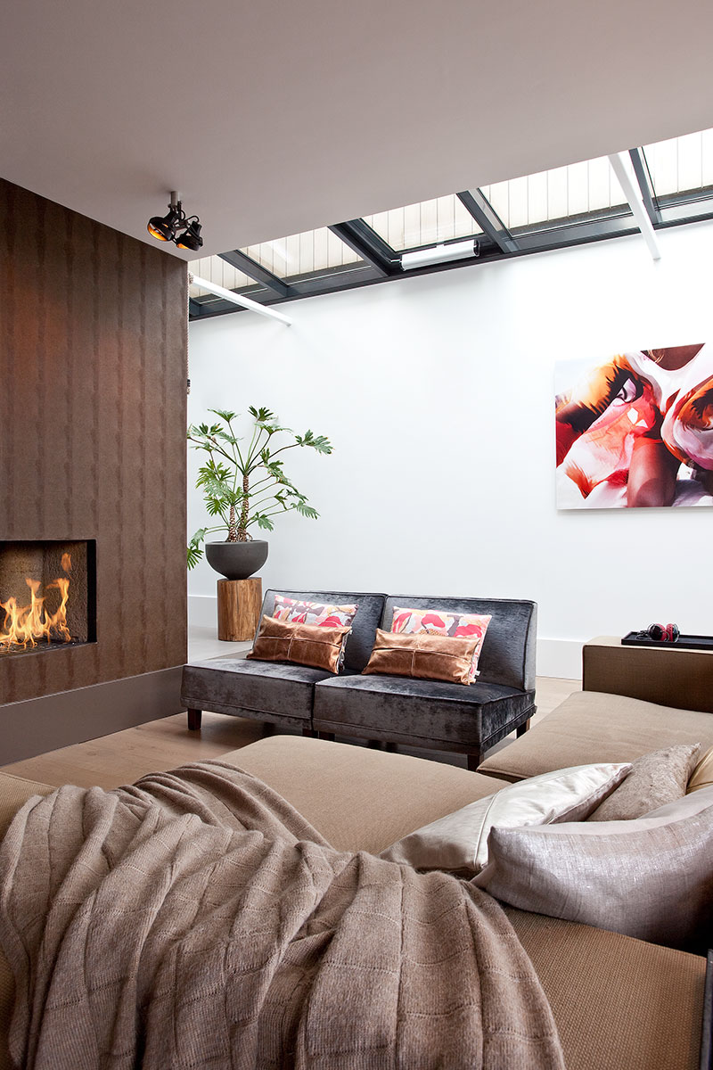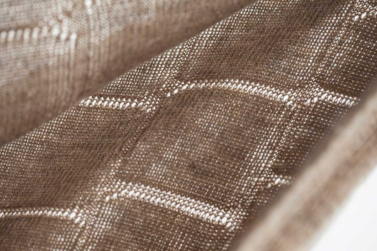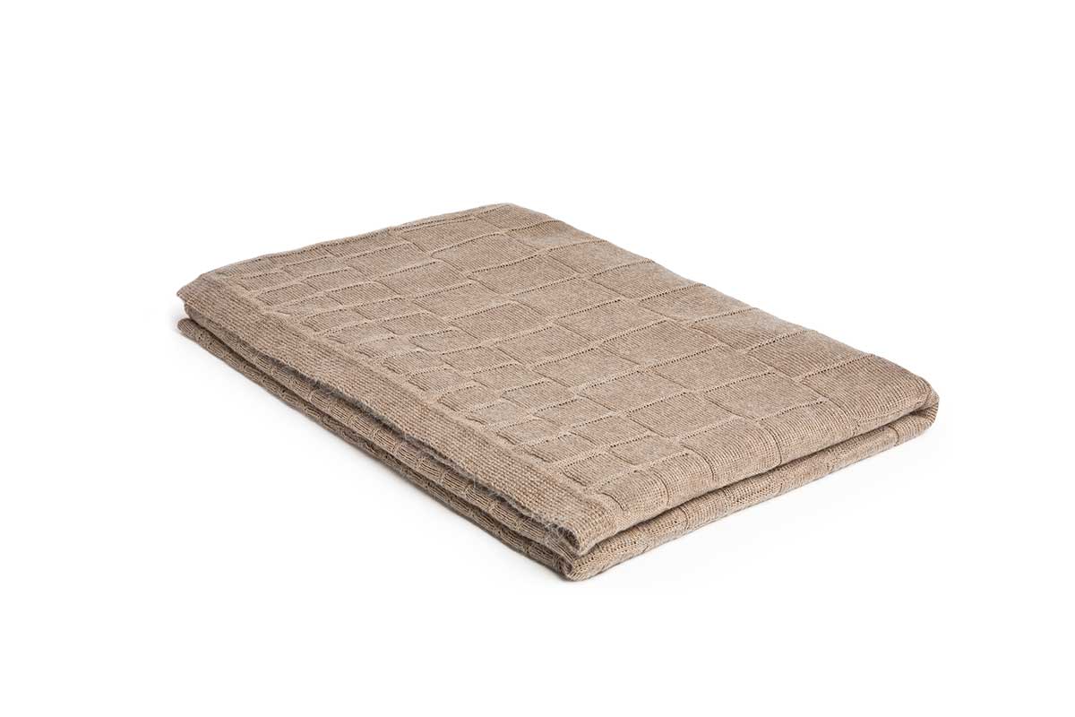 De royale Croco deken, van taupe kleurig mohair met ingebreid croco-reliëf siert bed én bank met onverholen, tijdloze weelde.