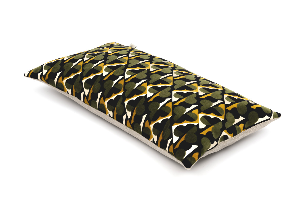 Een opvallend kussen in aardetinten ecru, groen, zwart en oker. De sprekende kleuren en zachte textuur dagen uit om creatief te combineren met andere items, als eenheid of in contrast.