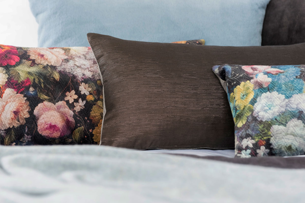 Sierkussen Frozen is een toonbeeld van raffinement. Uitgevoerd in subtiel glanzende metallic viscose Night en een achterkant van puur linnen Taupe. De bescheiden schoonheid van Frozen past bij meerdere stijlen en settings.