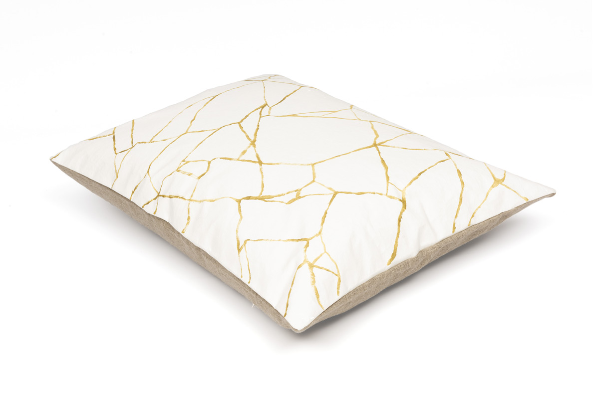 Sierkussen Kintsugi is een inventief ontwerp van Lianne Ernst, creative director bij Mrs.Me. Een gouden web van handgeschilderde penseelstreken volgt een onwillekeurig patroon van lijnen, ontstaan na het kreukelen van de stof. De techniek is geïnspireerd op Kintsugi, een Japanse kunstvorm waarbij goudlak wordt aangebracht op de barsten van gerepareerd keramiek, als achtergelaten sporen uit respect voor het object.