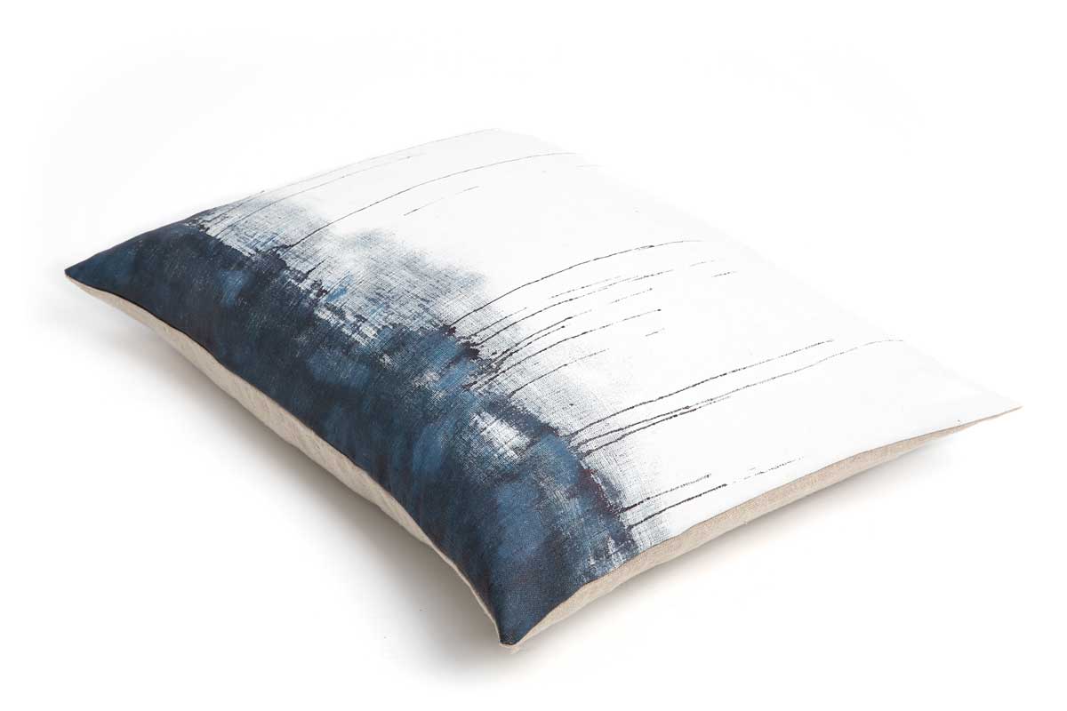 Kussen Oil on Canvas voegt mooier toe aan mooi en is meer dan decoratief. Oil on Canvas is gebaseerd op schildersdoek. De kussenhoes is uitgevoerd in wit gecoat linnen, dat met de hand is beschilderd. De abstracte patronen zijn met indigo kleurige inkt handmatig aangebracht. Recht uit het hart op het canvas. Dit geeft ieder kussen een unieke signatuur.