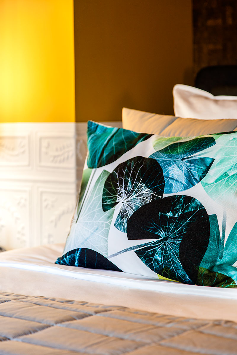 In de setting Conservatory is het bed opgemaakt met sierkussens Ophelia. De andere producten op het bed zijn ook te bekijken op de CONSERVATORY pagina.