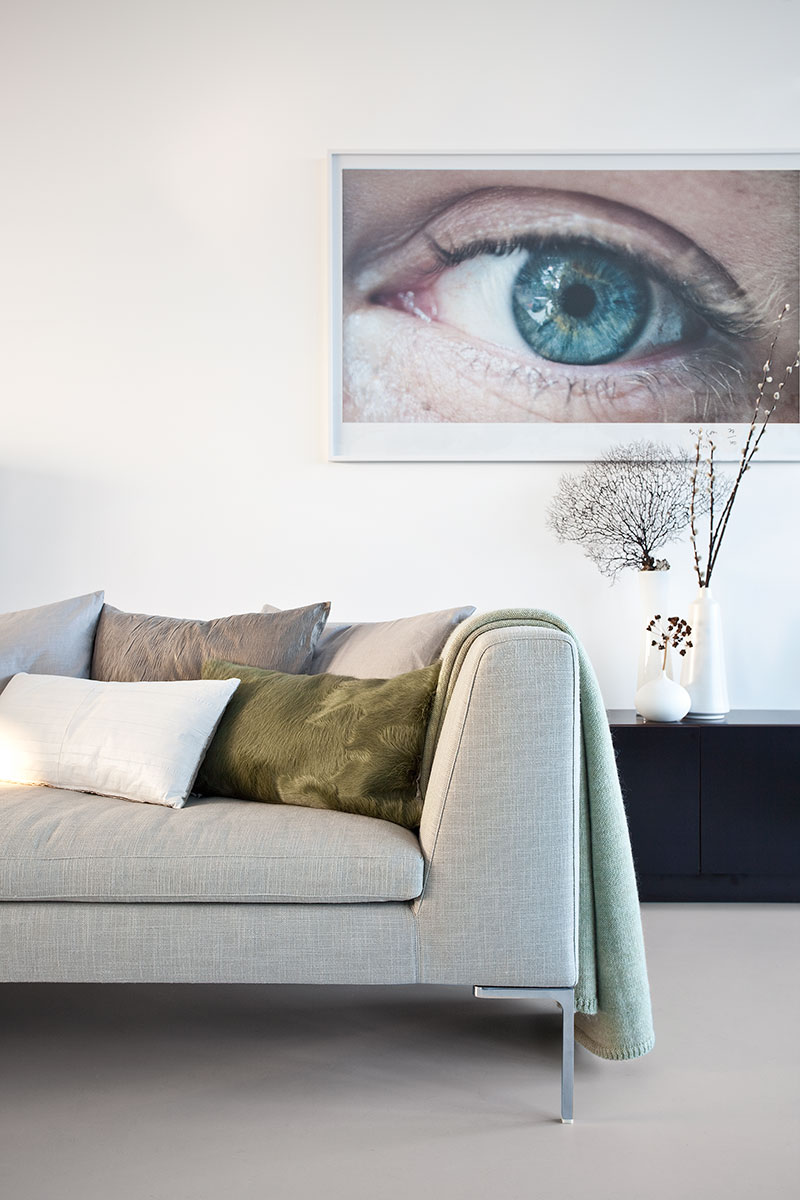In slaapkamer Tilda is het bed opgemaakt met leren sierkussens Pavilion White. De andere producten op het bed zijn ook te bekijken op de TILDA pagina.