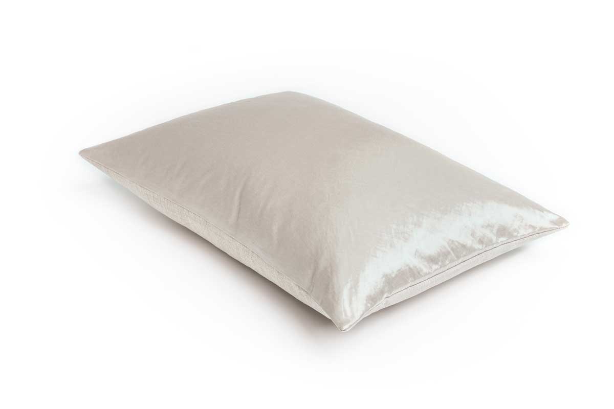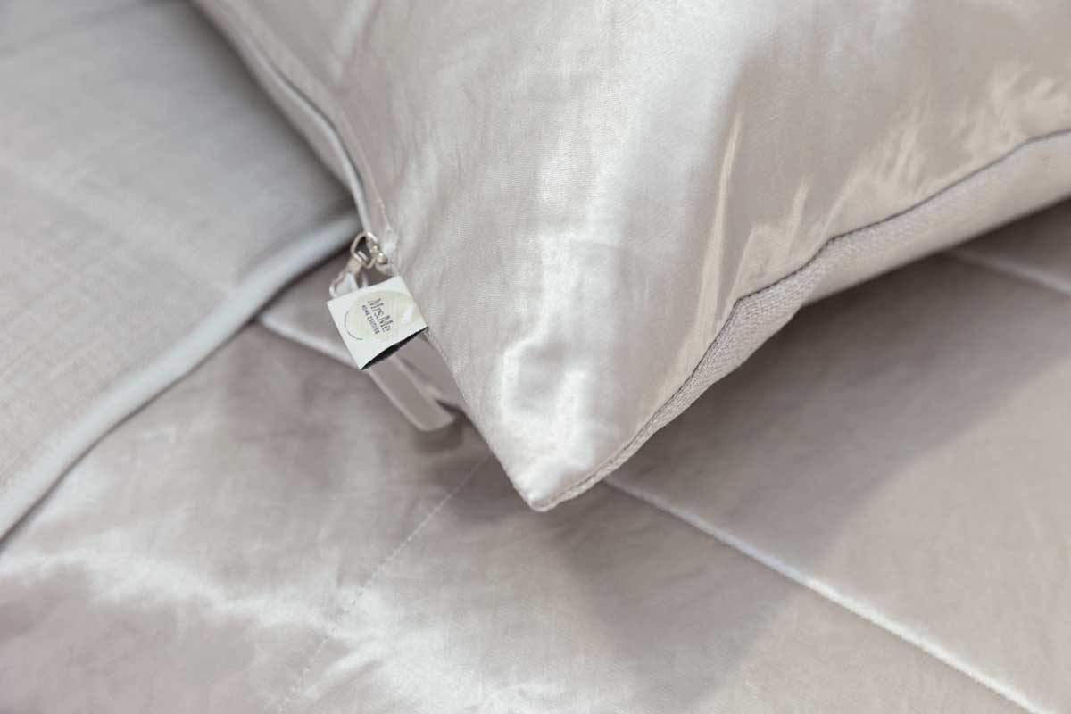 Sprei en sierkussen Sublime munten uit in gevoel en esthetische kwaliteit. Een oogstrelende set, met bijzondere contrasten in kleur en structuur. Een rijke, glanzende zijde viscose blend in de effen kleur Sand, in combinatie met de gemengde kleur Lightgrey Melee en een stoere textuur.