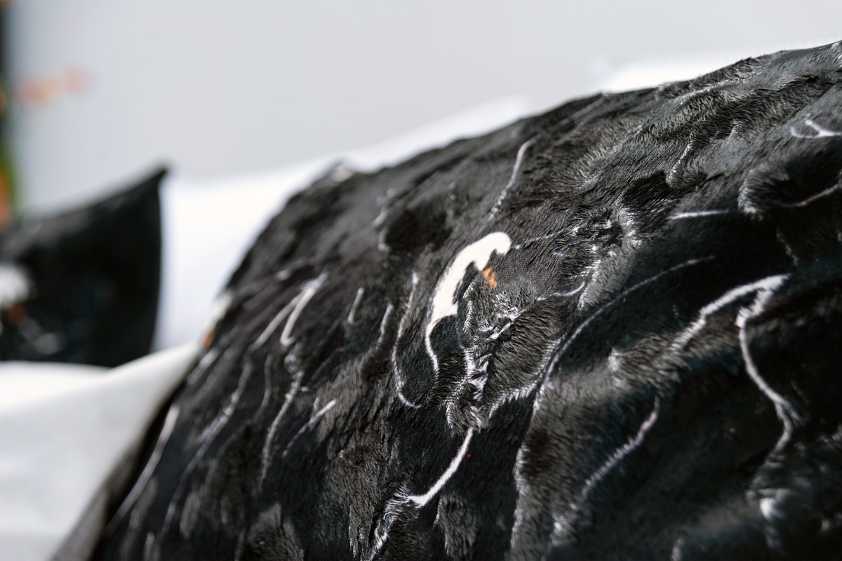 In dromerige schemering spreiden sierlijke wezens hun vleugels van zachte stof. Het dessin van kussen Swan toont de contouren van witte zwanen in rijk viscose katoen velours. Variaties in de textuur van de coating brengen de print voelbaar tot leven. De achterzijde van het kussen is wol Graphite.