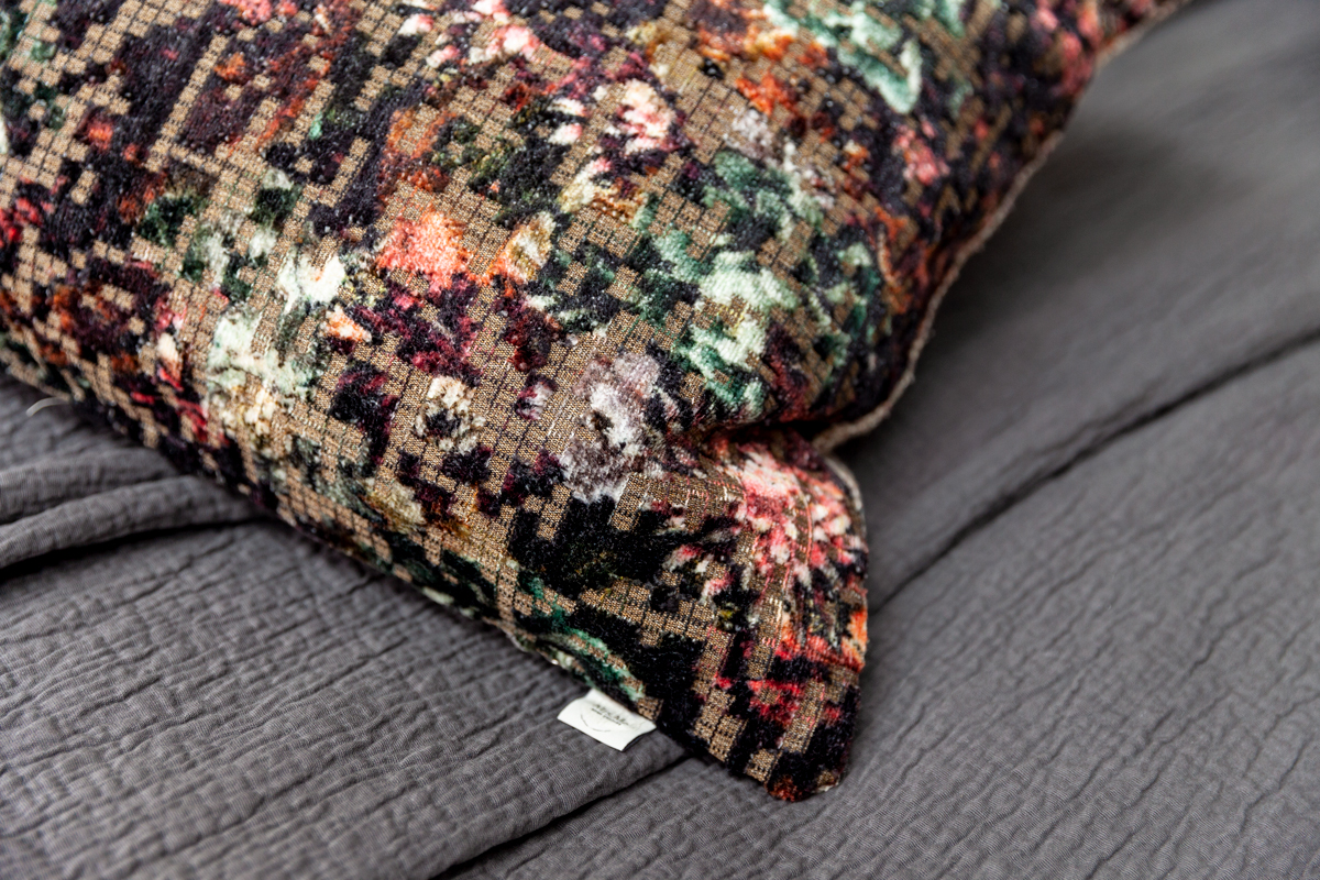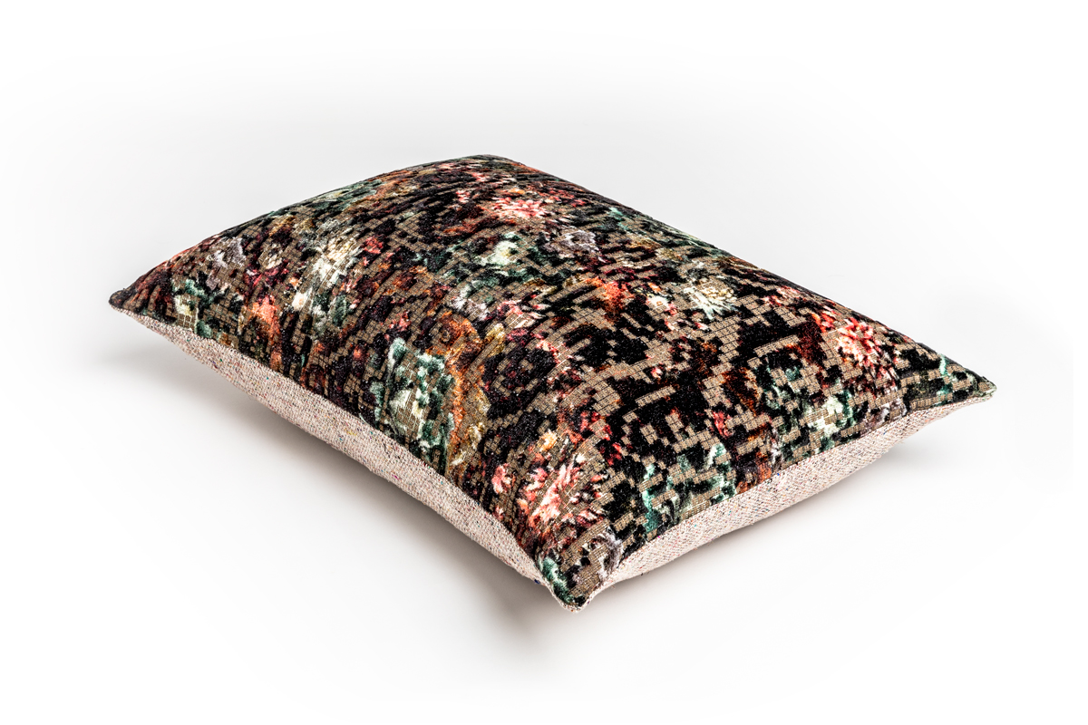 Kussen Waterlily bewaart een geheim. In het jacquard geweven velours leven Japanse koi en bloemen vol kleur harmonieus samen. Soms achter het patroon verscholen, maar voor kenners van echte schoonheid altijd zichtbaar. Waterlily is uitgevoerd in Multiblack, met een achterkant van 100% ruwe zijde.