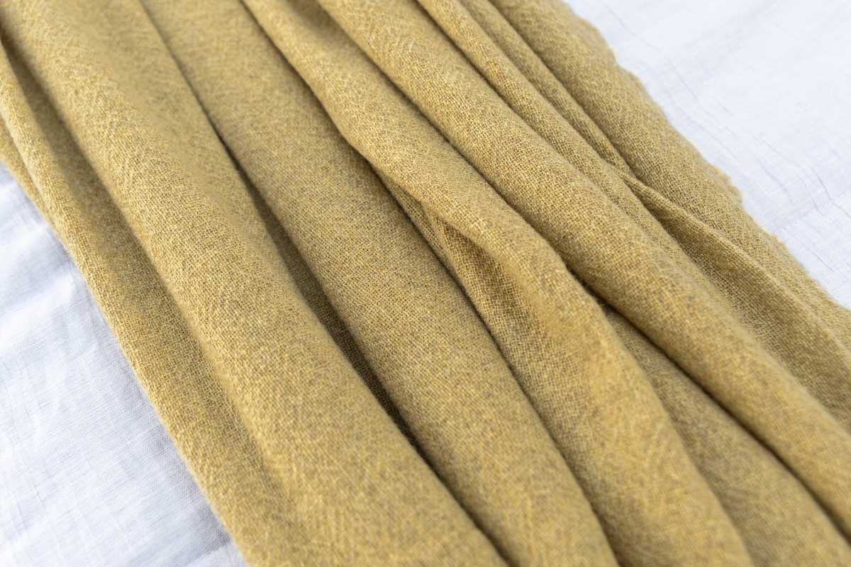 Fly is a mesmerizing throw of pure new wool in a loose weave, colour Mustard Melee.